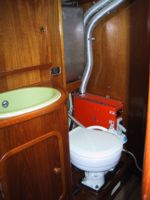 Toilet section also accommodates the heater and holding tank. Opposite are the lockers for clothes and linen. |